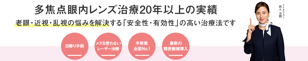 日本で、最も早く(約18年前)から、一貫して多焦点眼内レンズによる水晶体再建手術に携わってきた鈴木高佳理事長の率いる眼科グループだから、安心して治療を受けることができます。